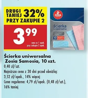 Cena produktu r贸偶ni si臋 w zale偶no艣ci od wybranego sklepu. Niestety nie posiadamy danych o aktualnych promocjach, jednak w艣r贸d archiwalnych ofert 艢cierka uniwersalna fala Zosia samosia kosztuje od 3,49 z艂 do 3,99 z艂.