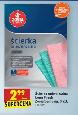 Cena produktu r贸偶ni si臋 w zale偶no艣ci od wybranego sklepu. Niestety nie posiadamy danych o aktualnych promocjach, jednak w艣r贸d archiwalnych ofert 艢cierka uniwersalna long fresh Zosia samosia kosztuje od 2,99 z艂 do 3,49 z艂.