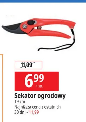 Cena produktu r贸偶ni si臋 w zale偶no艣ci od wybranego sklepu. Produkt Sekator ogrodowy 19 cm mo偶esz kupi膰 w promocji ju偶 od 14,99 z艂. Najta艅sza oferta, jak膮 mamy w naszej bazie jest z sieci Bricomarche. Sekator ogrodowy 19 cm kosztuje aktualnie 14,99 z艂. Zobacz ofert臋