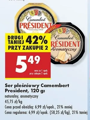 Cena produktu r贸偶ni si臋 w zale偶no艣ci od wybranego sklepu. Niestety nie posiadamy danych o aktualnych promocjach, jednak w艣r贸d archiwalnych ofert Ser camembert aromatyczny President kosztuje od 5,29 z艂 do 5,99 z艂.