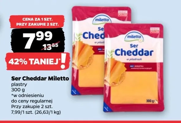 Cena produktu r贸偶ni si臋 w zale偶no艣ci od wybranego sklepu. Niestety nie posiadamy danych o aktualnych promocjach, jednak w艣r贸d archiwalnych ofert Ser cheddar plastry Miletto kosztuje od 6,99 z艂 do 10,99 z艂.
