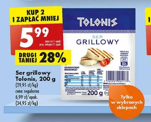 Cena produktu r贸偶ni si臋 w zale偶no艣ci od wybranego sklepu. Niestety nie posiadamy danych o aktualnych promocjach, jednak w艣r贸d archiwalnych ofert Ser grillowy Tolonis kosztuje od 4,99 z艂 do 5,99 z艂.