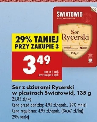 Cena produktu r贸偶ni si臋 w zale偶no艣ci od wybranego sklepu. Niestety nie posiadamy danych o aktualnych promocjach, jednak w艣r贸d archiwalnych ofert Ser rycerski plastry 艢wiatowid kosztuje od 2,48 z艂 do 3,99 z艂.