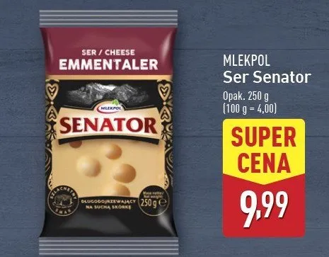 Cena produktu r贸偶ni si臋 w zale偶no艣ci od wybranego sklepu. Niestety nie posiadamy danych o aktualnych promocjach, jednak w艣r贸d archiwalnych ofert Ser senator Mlekpol kosztuje od 8,99 z艂 do 10,99 z艂.
