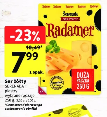 Cena produktu r贸偶ni si臋 w zale偶no艣ci od wybranego sklepu. Niestety nie posiadamy danych o aktualnych promocjach, jednak w艣r贸d archiwalnych ofert Ser z艂oty radamer w plastrach Serenada kosztuje od 7,39 z艂 do 8,59 z艂.