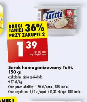 Cena produktu r贸偶ni si臋 w zale偶no艣ci od wybranego sklepu. Niestety nie posiadamy danych o aktualnych promocjach, jednak w艣r贸d archiwalnych ofert Serek czekoladowy Tutti kosztuje od 1,39 z艂.