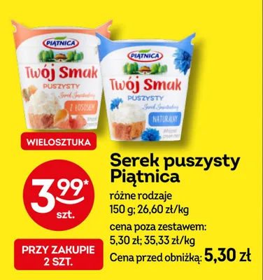 Cena produktu r贸偶ni si臋 w zale偶no艣ci od wybranego sklepu. Niestety nie posiadamy danych o aktualnych promocjach, jednak w艣r贸d archiwalnych ofert Serek puszysty z 艂ososiem Pi膮tnica tw贸j smak kosztuje od 3,99 z艂 do 4,7 z艂.