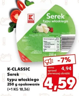 Cena produktu r贸偶ni si臋 w zale偶no艣ci od wybranego sklepu. Niestety nie posiadamy danych o aktualnych promocjach, jednak w艣r贸d archiwalnych ofert Serek typu w艂oskiego K-classic kosztuje od 3,99 z艂 do 4,59 z艂.
