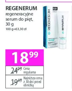 Cena produktu r贸偶ni si臋 w zale偶no艣ci od wybranego sklepu. Niestety nie posiadamy danych o aktualnych promocjach, jednak w艣r贸d archiwalnych ofert Serum do pi臋t Regenerum kosztuje od 14,99 z艂 do 18,99 z艂.