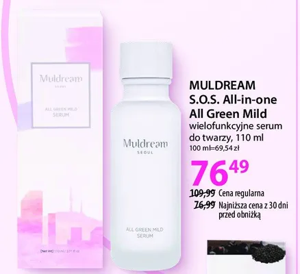 Cena produktu r贸偶ni si臋 w zale偶no艣ci od wybranego sklepu. Niestety nie posiadamy danych o aktualnych promocjach, jednak w艣r贸d archiwalnych ofert Serum do twarzy all green mild Muldream kosztuje od 76,49 z艂 do 76,99 z艂.