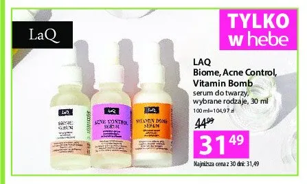 Cena produktu r贸偶ni si臋 w zale偶no艣ci od wybranego sklepu. Niestety nie posiadamy danych o aktualnych promocjach, jednak w艣r贸d archiwalnych ofert Serum do twarzy biome Laq kosztuje od 31,49 z艂.