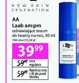 Cena produktu r贸偶ni si臋 w zale偶no艣ci od wybranego sklepu. Niestety nie posiadamy danych o aktualnych promocjach, jednak w艣r贸d archiwalnych ofert Serum do twarzy odbudowuj膮ce Aa laab kosztuje od 39,99 z艂.