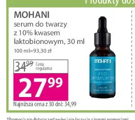 Cena produktu r贸偶ni si臋 w zale偶no艣ci od wybranego sklepu. Niestety nie posiadamy danych o aktualnych promocjach, jednak w艣r贸d archiwalnych ofert Serum do twarzy z 10% kwasem laktobionowym MOHANI kosztuje od 27,99 z艂.