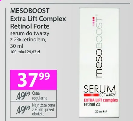 Cena produktu r贸偶ni si臋 w zale偶no艣ci od wybranego sklepu. Niestety nie posiadamy danych o aktualnych promocjach, jednak w艣r贸d archiwalnych ofert Serum do twarzy z retinolem 2% Mesoboost kosztuje od 36,99 z艂 do 39,99 z艂.
