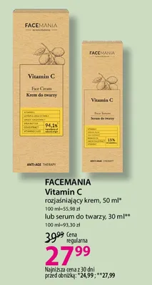 Cena produktu r贸偶ni si臋 w zale偶no艣ci od wybranego sklepu. Niestety nie posiadamy danych o aktualnych promocjach, jednak w艣r贸d archiwalnych ofert Serum do twarzy z retinolem i witamin膮 c FACEMANIA kosztuje od 27,99 z艂 do 31,99 z艂.