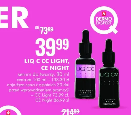 Cena produktu r贸偶ni si臋 w zale偶no艣ci od wybranego sklepu. Niestety nie posiadamy danych o aktualnych promocjach, jednak w艣r贸d archiwalnych ofert Serum do twarzy z witamin膮 e Liq ce kosztuje od 34,99 z艂 do 41,99 z艂.
