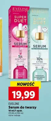 Cena produktu r贸偶ni si臋 w zale偶no艣ci od wybranego sklepu. Niestety nie posiadamy danych o aktualnych promocjach, jednak w艣r贸d archiwalnych ofert Serum na niedoskona艂o艣ci EVELINE SUPERDUET kosztuje od 19,99 z艂.