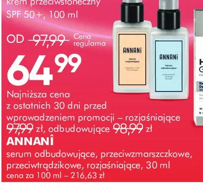 Cena produktu r贸偶ni si臋 w zale偶no艣ci od wybranego sklepu. Niestety nie posiadamy danych o aktualnych promocjach, jednak w艣r贸d archiwalnych ofert Serum przeciwtr膮dzikowe Annani kosztuje od 64,99 z艂 do 74,99 z艂.