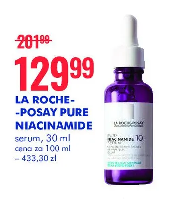 Cena produktu r贸偶ni si臋 w zale偶no艣ci od wybranego sklepu. Niestety nie posiadamy danych o aktualnych promocjach, jednak w艣r贸d archiwalnych ofert Serum przeciwzmarszczkowe La roche-posay pure niacinamide 10 kosztuje od 129,99 z艂.