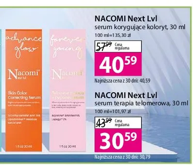 Cena produktu r贸偶ni si臋 w zale偶no艣ci od wybranego sklepu. Niestety nie posiadamy danych o aktualnych promocjach, jednak w艣r贸d archiwalnych ofert Serum terapia telomerowa NACOMI NEXT LEVEL kosztuje od 30,59 z艂.