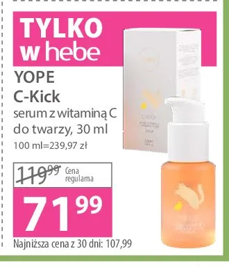 Cena produktu r贸偶ni si臋 w zale偶no艣ci od wybranego sklepu. Niestety nie posiadamy danych o aktualnych promocjach, jednak w艣r贸d archiwalnych ofert Serum z witamin膮 c YOPE C-KICK kosztuje od 59,99 z艂 do 85,99 z艂.
