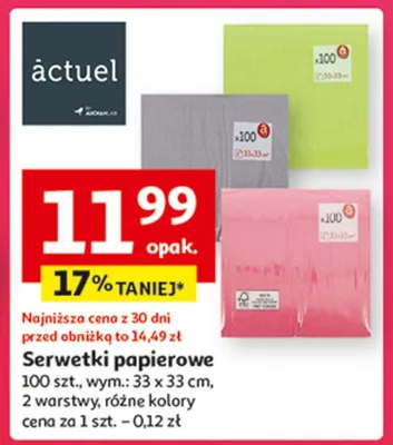 Zastanawiasz si臋, gdzie kupi膰 i ile kosztuje produkt Serwetki 33 x 33 cm Actuel? Regularnie sprawdzamy, czy jest promocja na ten produkt w Biedronka, Lidl, Kaufland, Auchan, Netto, Makro i innych sklepach. Aktualnie nie posiadamy ofert promocyjnych na ten produkt.