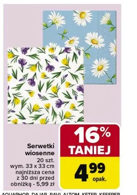 Serwetki wiosenne wym. 33 x 33 cm aktualnie nie wyst臋puje w bazie naszych gazetek promocyjnych. Nie martw si臋! Gdy tylko pojawi si臋 ciekawa promocja na Serwetki wiosenne wym. 33 x 33 cm, umie艣cimy j膮 na naszej stronie