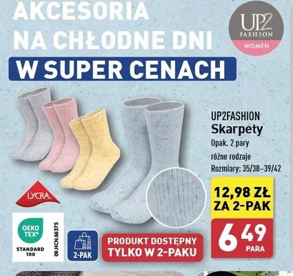 Zastanawiasz si臋, gdzie kupi膰 i ile kosztuje produkt Skarpety damskie 35-38 Up2fashion? Regularnie sprawdzamy, czy jest promocja na ten produkt w Biedronka, Lidl, Kaufland, Auchan, Netto, Makro i innych sklepach. Aktualnie nie posiadamy ofert promocyjnych na ten produkt.