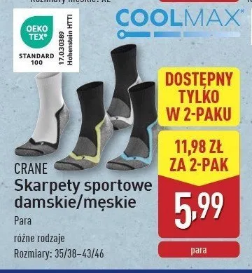 Zastanawiasz si臋, gdzie kupi膰 i ile kosztuje produkt Skarpety sportowe d艂ugie CRANE? Regularnie sprawdzamy, czy jest promocja na ten produkt w Biedronka, Lidl, Kaufland, Auchan, Netto, Makro i innych sklepach. Aktualnie nie posiadamy ofert promocyjnych na ten produkt.