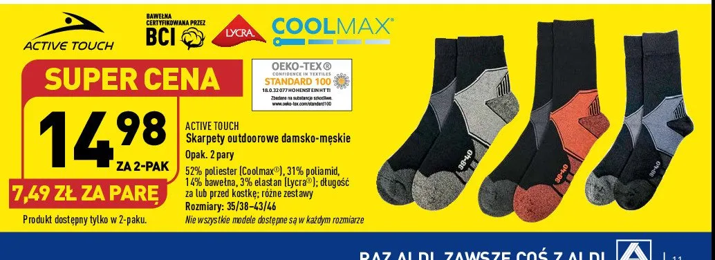 Zastanawiasz si臋, gdzie kupi膰 i ile kosztuje produkt Skarpety sportowe outdoor m臋skie 43-46 Active touch? Regularnie sprawdzamy, czy jest promocja na ten produkt w Biedronka, Lidl, Kaufland, Auchan, Netto, Makro i innych sklepach. Aktualnie nie posiadamy ofert promocyjnych na ten produkt.