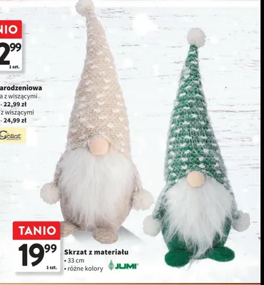 Cena produktu r贸偶ni si臋 w zale偶no艣ci od wybranego sklepu. Niestety nie posiadamy danych o aktualnych promocjach, jednak w艣r贸d archiwalnych ofert Skrzat z materia艂u w czapce Jumi kosztuje od 19,99 z艂 do 39,99 z艂.