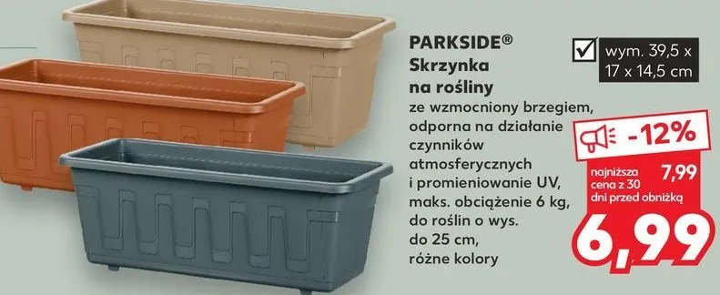 Cena produktu r贸偶ni si臋 w zale偶no艣ci od wybranego sklepu. Niestety nie posiadamy danych o aktualnych promocjach, jednak w艣r贸d archiwalnych ofert Skrzynka na ro艣liny 39.5 x 17 x 14.5 cm Parkside kosztuje od 6,99 z艂.