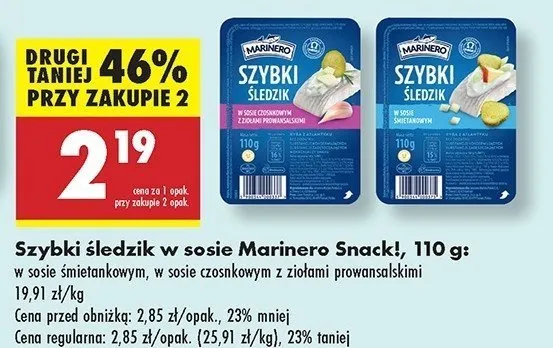 Cena produktu różni się w zależności od wybranego sklepu. Niestety nie posiadamy danych o aktualnych promocjach, jednak wśród archiwalnych ofert Śledź w sosie czosnkowym z ziołami prowansalskimi Marinero szybki śledzik kosztuje od 1,99 zł do 2,19 zł.