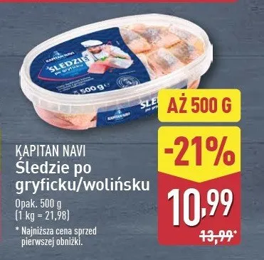 Cena produktu r贸偶ni si臋 w zale偶no艣ci od wybranego sklepu. Niestety nie posiadamy danych o aktualnych promocjach, jednak w艣r贸d archiwalnych ofert 艢ledzie po gryficku Kapitan Navi kosztuje od 10,99 z艂 do 11,99 z艂.
