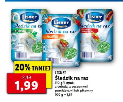 Cena produktu r贸偶ni si臋 w zale偶no艣ci od wybranego sklepu. Niestety nie posiadamy danych o aktualnych promocjach, jednak w艣r贸d archiwalnych ofert 艢ledzik na raz pikantny z chilli Lisner 艣ledzik na raz kosztuje od 1,99 z艂.