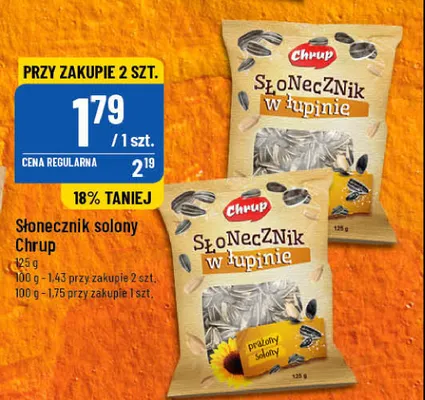Cena produktu różni się w zależności od wybranego sklepu. Niestety nie posiadamy danych o aktualnych promocjach, jednak wśród archiwalnych ofert Słonecznik w łupinie prażony solony Chrup kosztuje od 1,39 zł do 1,79 zł.