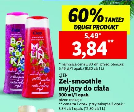 Cena produktu r贸偶ni si臋 w zale偶no艣ci od wybranego sklepu. Niestety nie posiadamy danych o aktualnych promocjach, jednak w艣r贸d archiwalnych ofert Smoothie do mycia cia艂a malina Cien kosztuje od 2,99 z艂 do 4,39 z艂.
