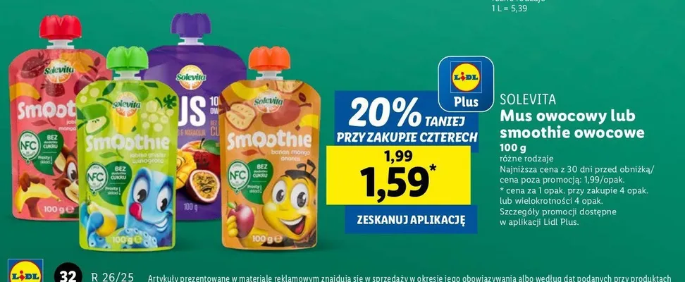 Zastanawiasz si臋, gdzie kupi膰 i ile kosztuje produkt Smoothie jab艂ko-gruszka-winogrono Solevita? Regularnie sprawdzamy, czy jest promocja na ten produkt w Biedronka, Lidl, Kaufland, Auchan, Netto, Makro i innych sklepach. Aktualnie nie posiadamy ofert promocyjnych na ten produkt.