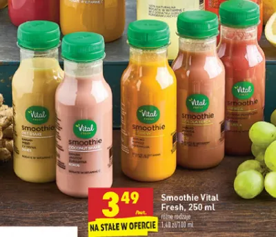 Cena produktu r贸偶ni si臋 w zale偶no艣ci od wybranego sklepu. Niestety nie posiadamy danych o aktualnych promocjach, jednak w艣r贸d archiwalnych ofert Smoothie oat shake Vital fresh smoothie kosztuje od 3,49 z艂.