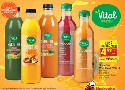 Cena produktu r贸偶ni si臋 w zale偶no艣ci od wybranego sklepu. Niestety nie posiadamy danych o aktualnych promocjach, jednak w艣r贸d archiwalnych ofert Smoothie og贸rek burak seler jab艂ko banan Vital fresh smoothie kosztuje od 3,99 z艂 do 4,49 z艂.