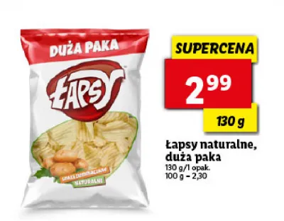 Cena produktu r贸偶ni si臋 w zale偶no艣ci od wybranego sklepu. Niestety nie posiadamy danych o aktualnych promocjach, jednak w艣r贸d archiwalnych ofert Snaki ziemniaczane naturalne 艁apsy kosztuje od 2,99 z艂.