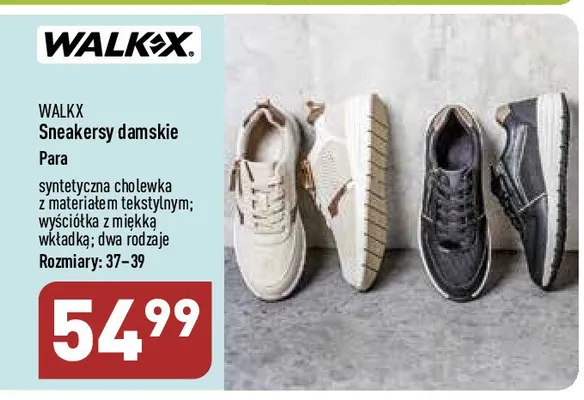 Cena produktu r贸偶ni si臋 w zale偶no艣ci od wybranego sklepu. Produkt Sneakersy damskie 37-39 Walkx mo偶esz kupi膰 w promocji ju偶 od 49,99 z艂. Najta艅sza oferta, jak膮 mamy w naszej bazie jest z sieci Lidl. Sneakersy damskie 37-39 Walkx kosztuje aktualnie 49,99 z艂. Zobacz ofert臋