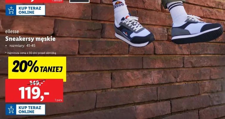Nie wiesz gdzie kupi膰 produkt Sneakersy m臋skie 41-45 ELLESSE w promocji? Aktualnie produkt Sneakersy m臋skie 41-45 ELLESSE znajduje si臋 w atrakcyjnej cenie w sklepach Aldi. Opr贸cz tego produkt mo偶na kupi膰 w innych sklepach, jednak aktulanie nie posiadamy informacji o promocjach w nich.