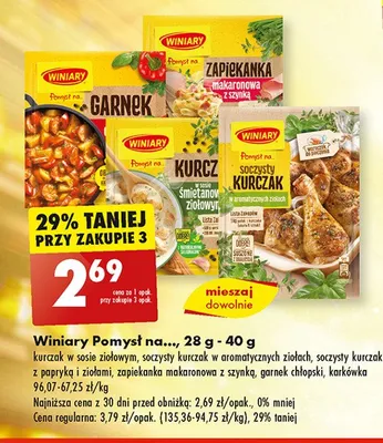 Cena produktu różni się w zależności od wybranego sklepu. Niestety nie posiadamy danych o aktualnych promocjach, jednak wśród archiwalnych ofert Soczystą karkówkę z ziemniakami Winiary pomysł na ... kosztuje od 2,69 zł do 3,69 zł.