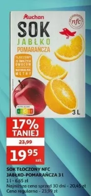 Cena produktu różni się w zależności od wybranego sklepu. Niestety nie posiadamy danych o aktualnych promocjach, jednak wśród archiwalnych ofert Sok jabłko-pomarańcza Auchan różnorodne (logo czerwone) kosztuje od 15,22 zł do 18,39 zł.