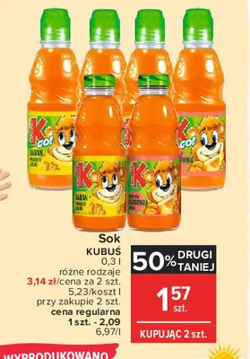 Cena produktu r贸偶ni si臋 w zale偶no艣ci od wybranego sklepu. Niestety nie posiadamy danych o aktualnych promocjach, jednak w艣r贸d archiwalnych ofert Sok marchew-jab艂ko-pomara艅cza Kubu艣 go! kosztuje od 1,57 z艂.