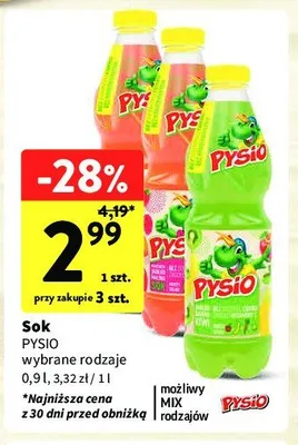 Cena produktu r贸偶ni si臋 w zale偶no艣ci od wybranego sklepu. Niestety nie posiadamy danych o aktualnych promocjach, jednak w艣r贸d archiwalnych ofert Sok marchew-jab艂ko-pomara艅cza Pysio kosztuje od 2,99 z艂.