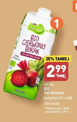 Cena produktu r贸偶ni si臋 w zale偶no艣ci od wybranego sklepu. Niestety nie posiadamy danych o aktualnych promocjach, jednak w艣r贸d archiwalnych ofert Sok z burak贸w Gut bio kosztuje od 2,79 z艂 do 2,99 z艂.