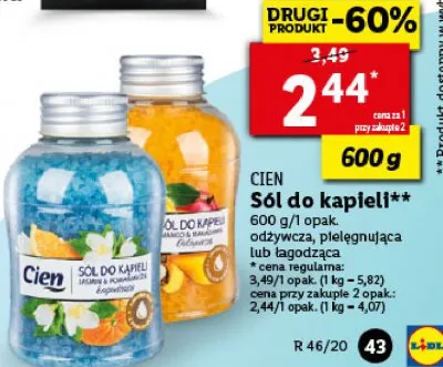 Cena produktu r贸偶ni si臋 w zale偶no艣ci od wybranego sklepu. Niestety nie posiadamy danych o aktualnych promocjach, jednak w艣r贸d archiwalnych ofert S贸l do k膮pieli jasmin i pomara艅cza Cien kosztuje od 2,44 z艂.