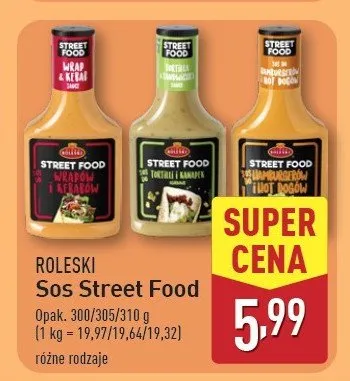 Cena produktu r贸偶ni si臋 w zale偶no艣ci od wybranego sklepu. Niestety nie posiadamy danych o aktualnych promocjach, jednak w艣r贸d archiwalnych ofert Sos do wrap贸w i kebab贸w Roleski street food kosztuje od 4,99 z艂 do 5,99 z艂.